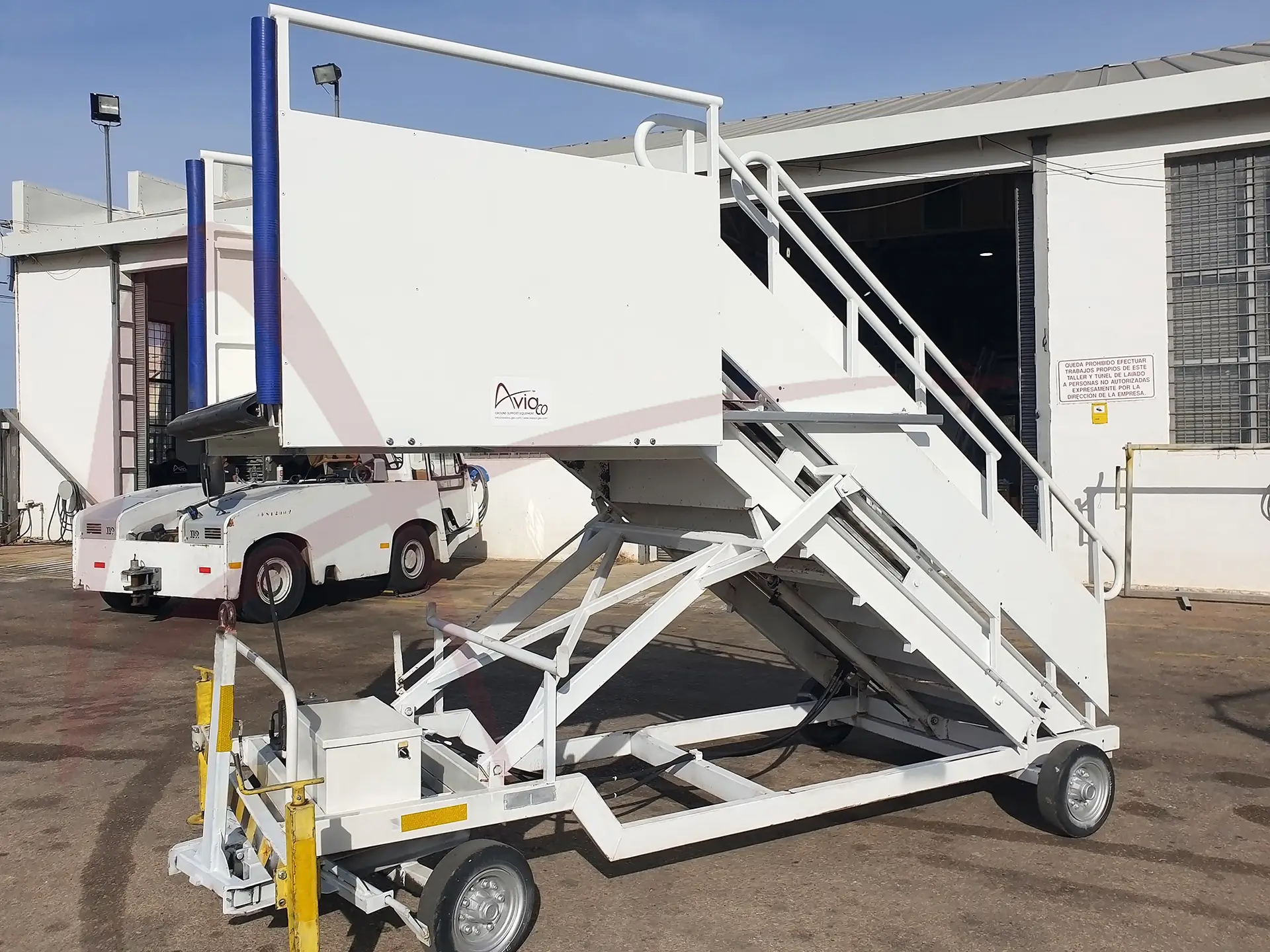 This series of stairs is designed for the boarding and disembarking of passengers in compliance with current regulations, on airplanes whose boarding height is between 1,764 and 3,920 millimeters, (A320, A321, etc…). It is made up of two flights of stairs: a fixed lower section, attached to the chassis by means of articulated joints, and the upper section that slides over the previous one using a manually operated hydraulic system; this system is equipped with a hydraulic cylinder and double-acting manual pump.The mobile section ends with an access platform, the front of which is articulated to adapt to the fuselage of the plane. This platform has two sliding doors on both sides that allow a perfect adjustment of the stair to the plane.All its elements are fixed to the frame of the stair. The front part is provided with two stabilizers with which we guarantee the stability and immobility of the stair during boarding, disembarkation and parking. This model of stairs is equipped with a set of lights on the steps to allow boarding and disembarking at night, powered by a 12v battery. The batteries have a charger that connects to the 220V AC network. This stair can be folded down and carried on its own chassis.Â
