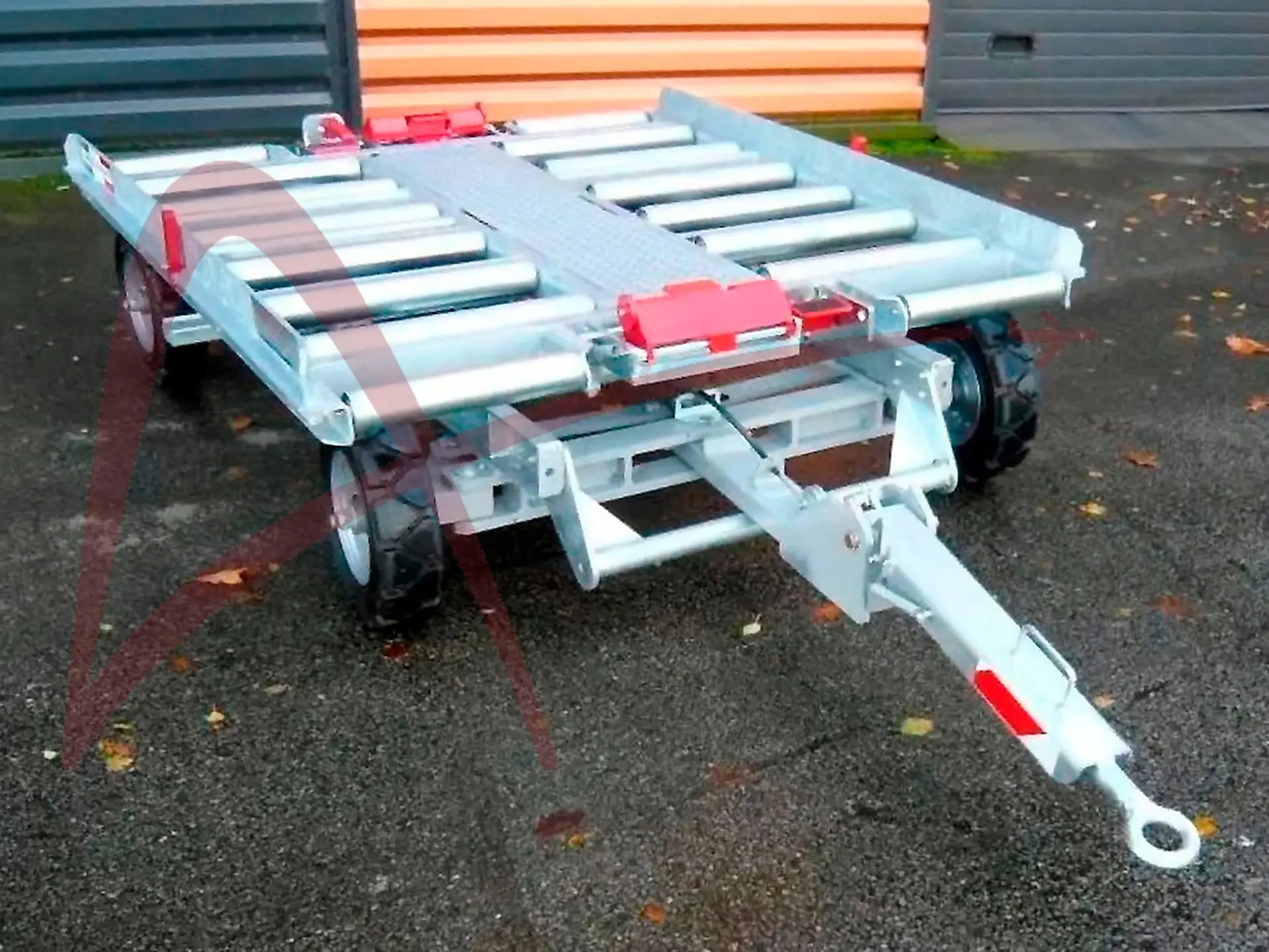 Container dolly with front swiveling axle, for side loading used for transporting freight or luggage packed in containers.