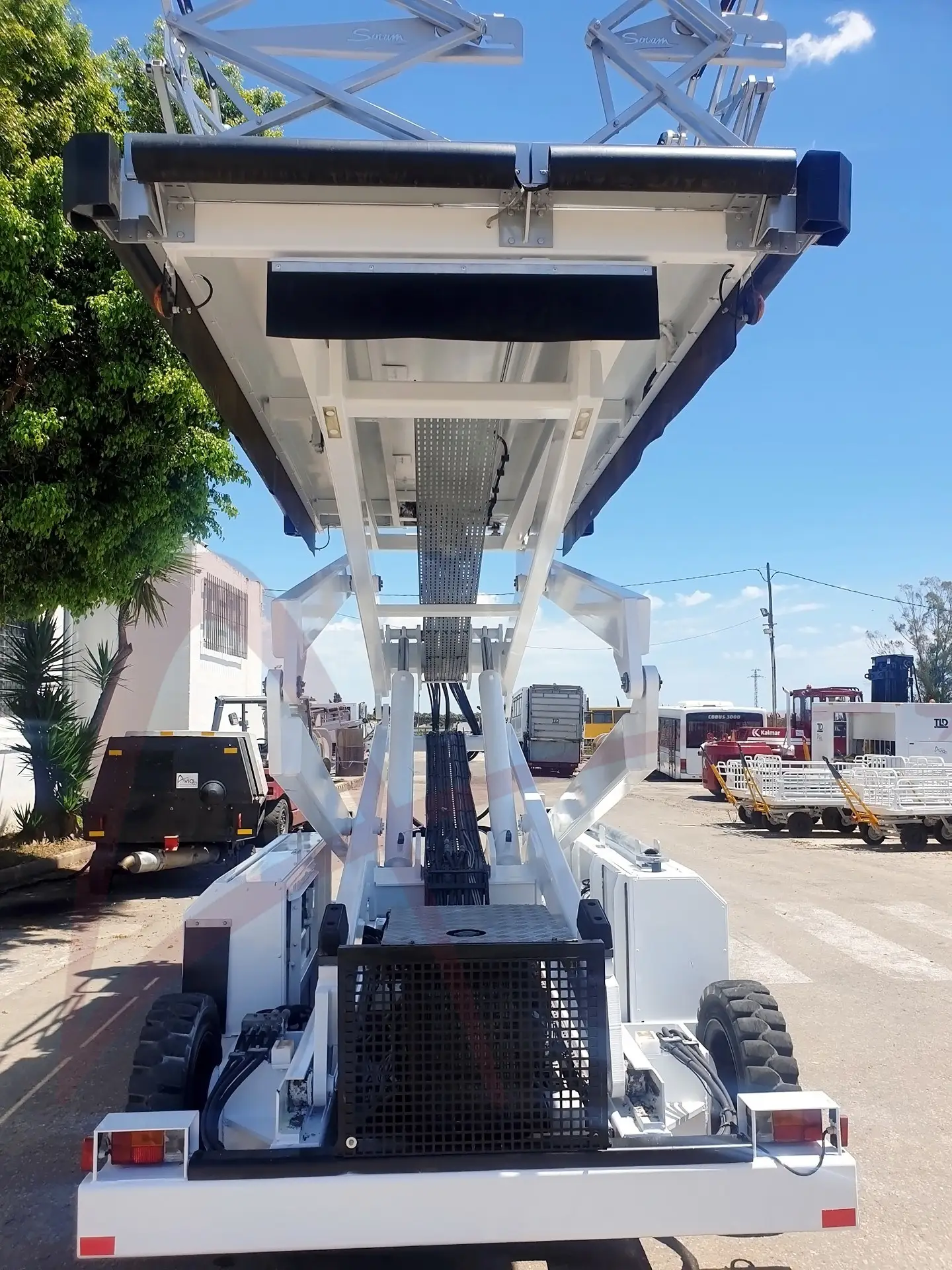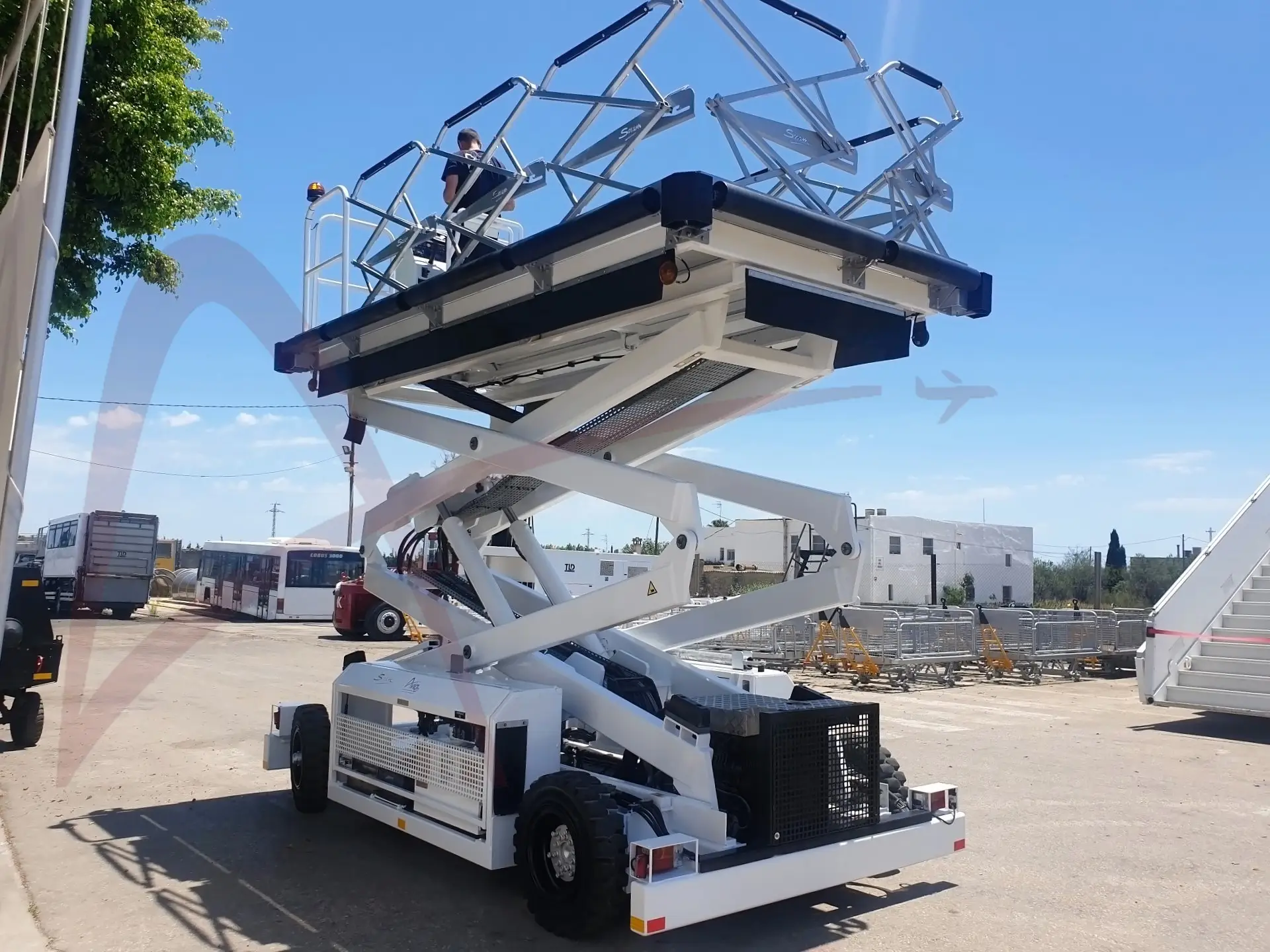 The plateau and its elevator system are installed on a motorized carrier. The platform is driven directly from the operating station located on the plateau. Its unrivaled stability enables the platform to operate at an upper position with winds up to 80kph (50 mph).